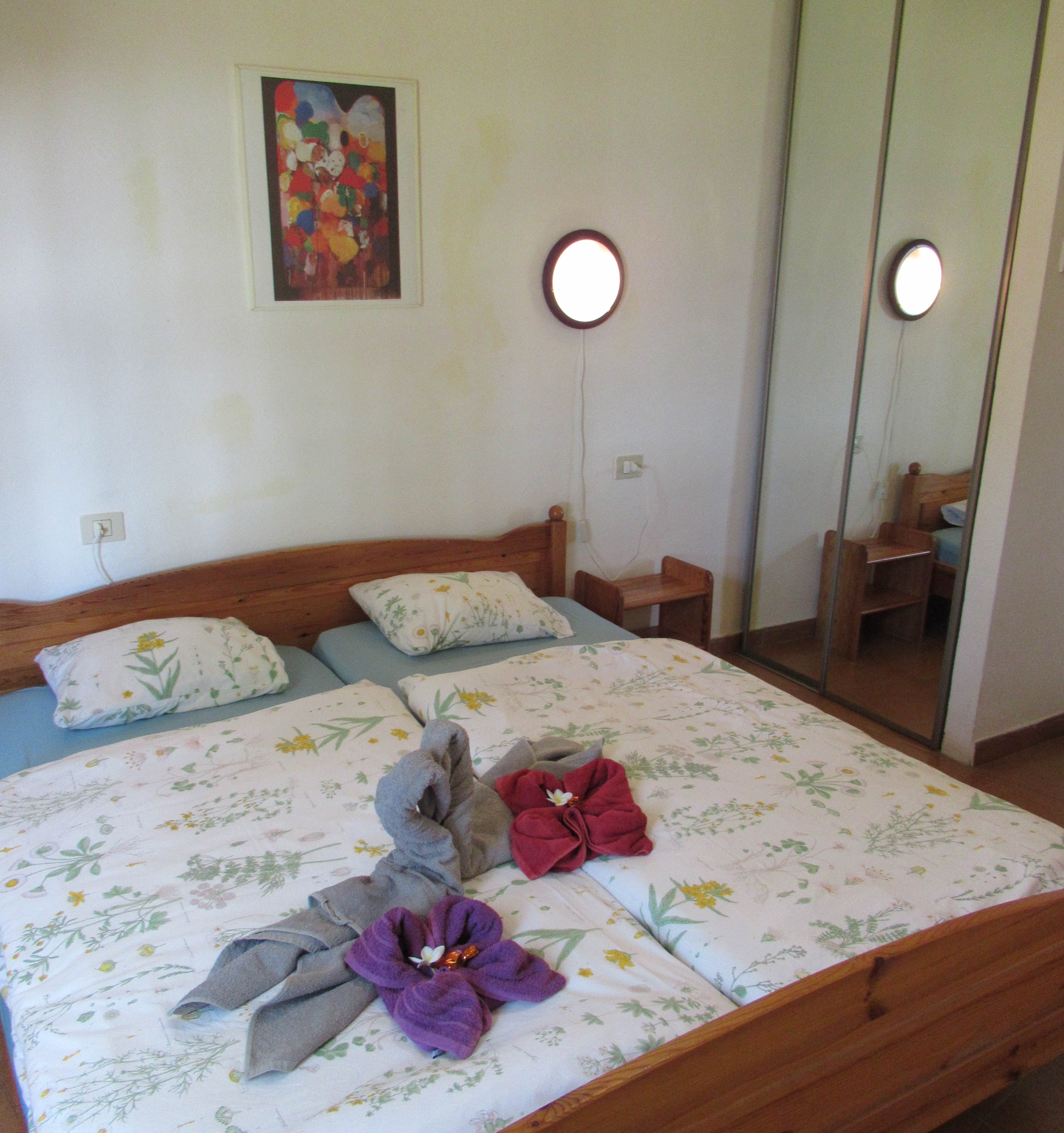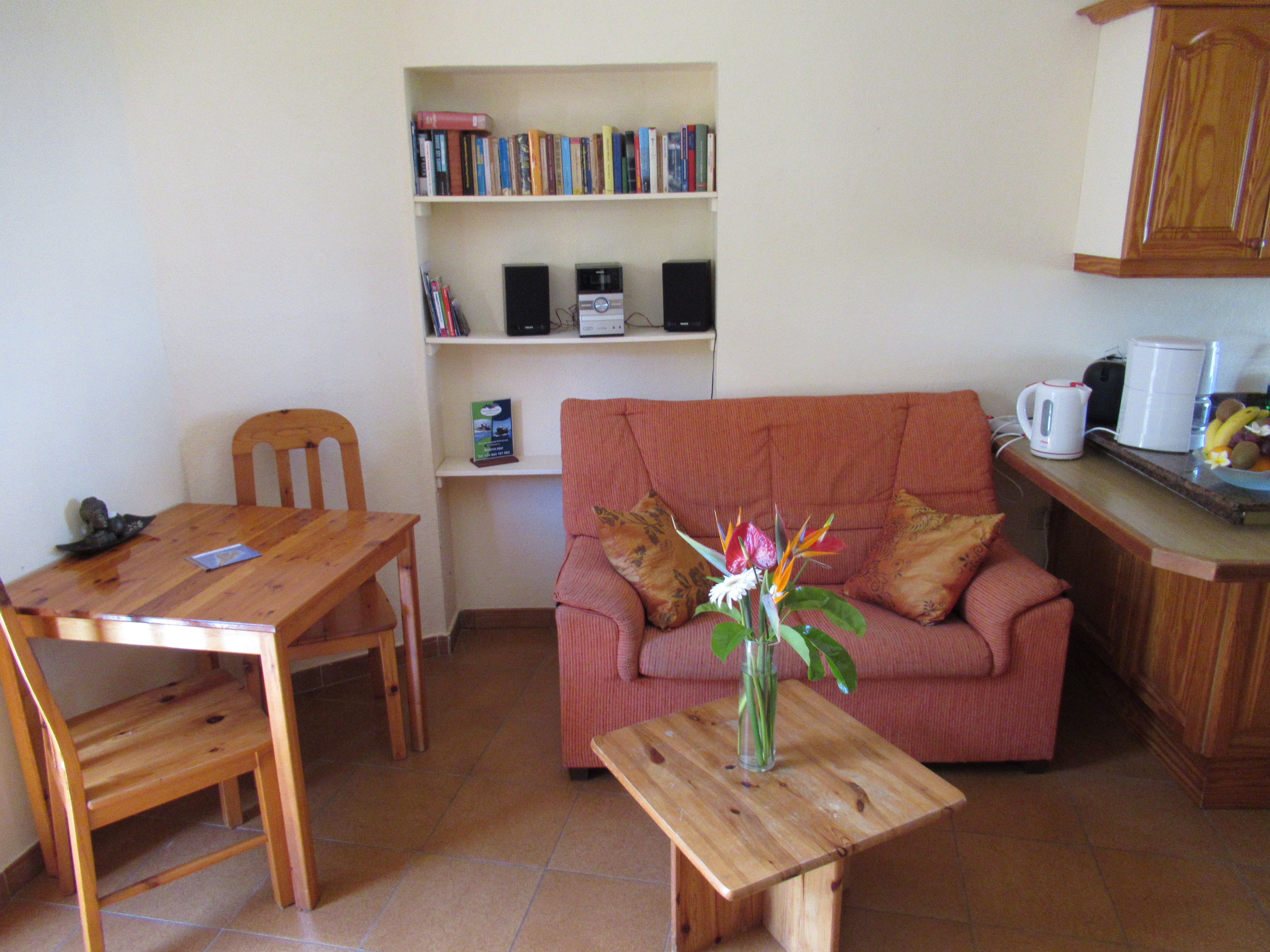 Schlafzimmer, Wohnraum inkl. Küche, Sat-TV, Musikanlage, Dusche/WC, möblierte Terrasse, Liegen und Meerblick.