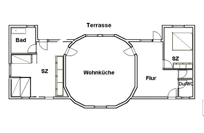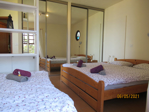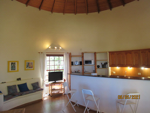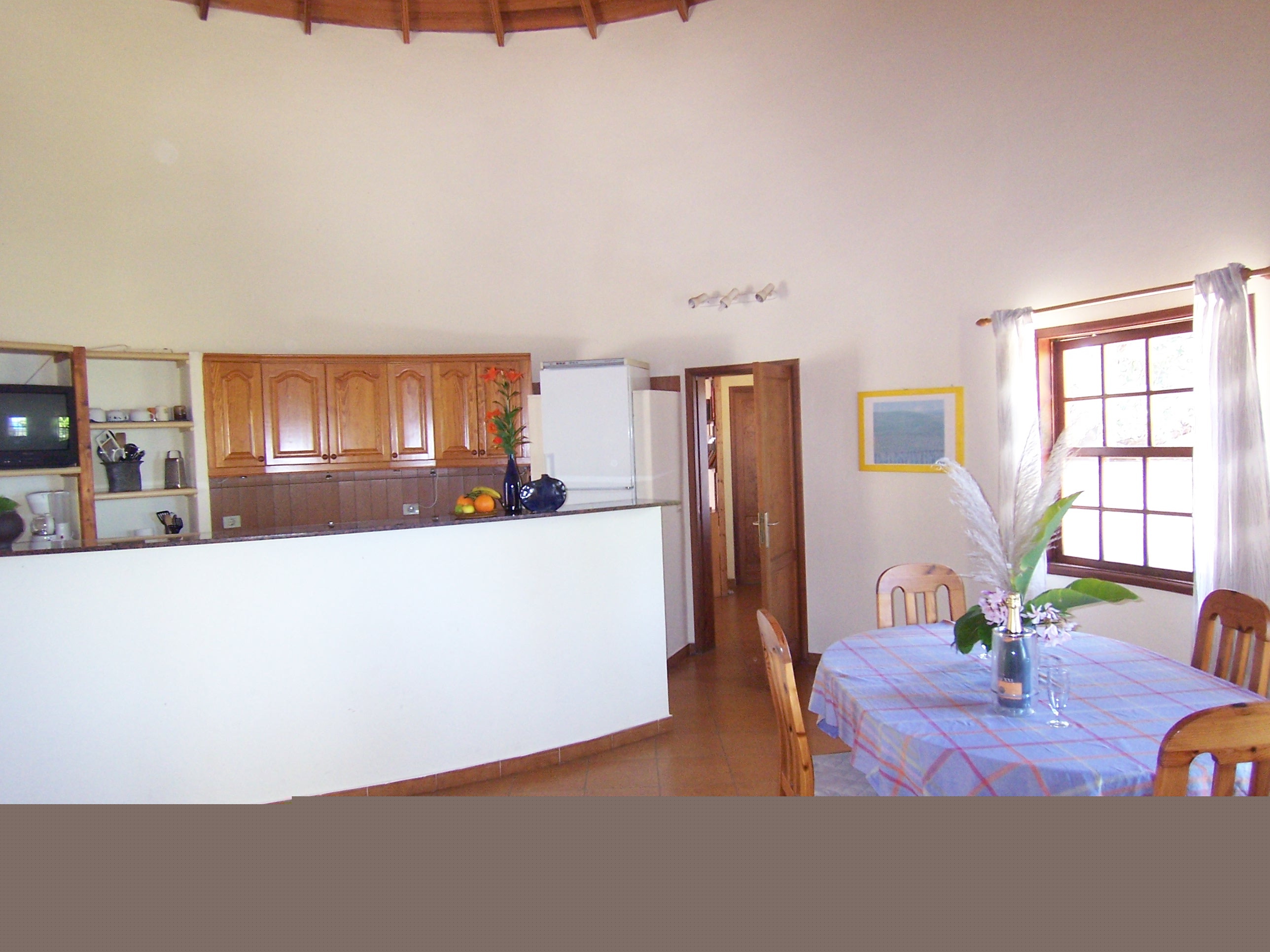 Turmappartement. 50 m² großer runder Wohnraum mit kanarischer Holzdecke bis 6m Höhe (inkl. Küche, Spül-/Waschmaschine), Sat-TV, Musikanlage, 2 Schlafzimmer mit je einer Dusche bzw. Bad und WC, möblierte Terrasse, Liegen und Meerblick. Reichhaltige Auswahl an Büchern.